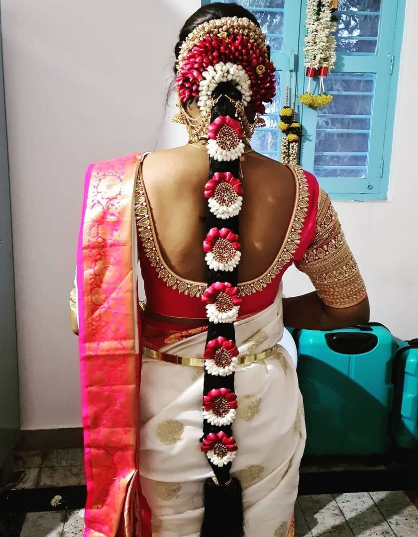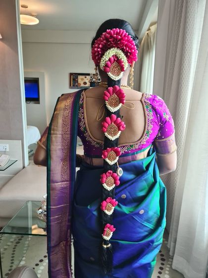 Your hairstyle completes your look. I specialize in a variety of styles, from traditional South Indian Poola Jada with fresh flowers to modern updos, romantic curls, and intricate braids, all customized to match your outfit and event.