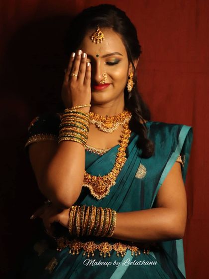 I specialize in traditional South Indian bridal makeup, combining cultural elements with modern techniques. My service includes complete bridal styling - from makeup application using premium products like MAC and Huda Beauty, to traditional hairstyling with floral accessories, and expert saree draping.