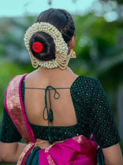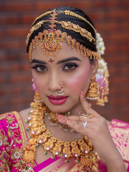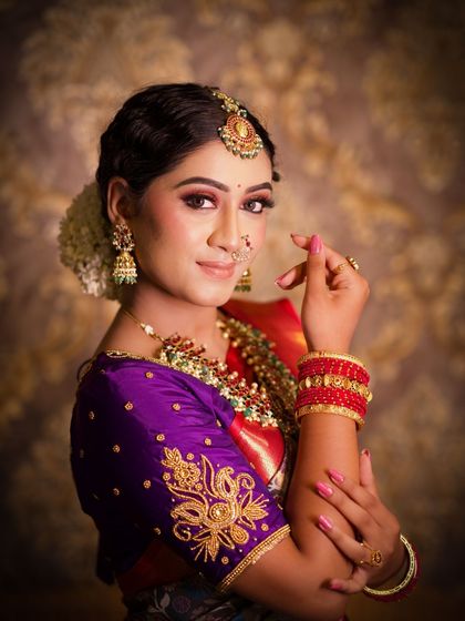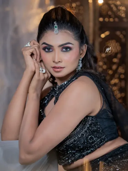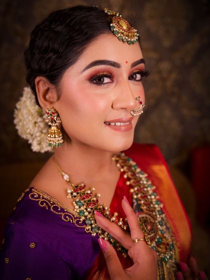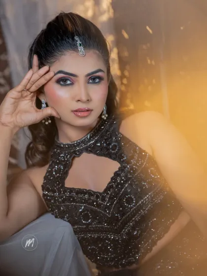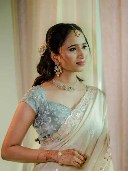 I do natural bridal and event makeup for dusky skin, plus hair styling and saree draping, so you look like yourself with a confident glow.