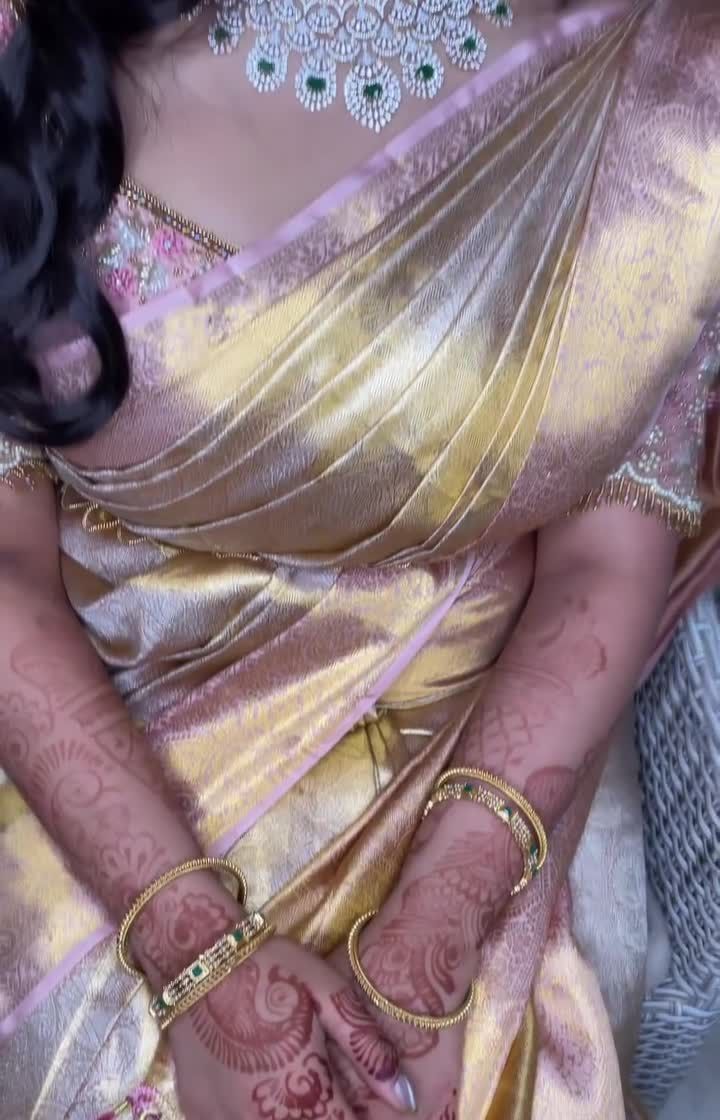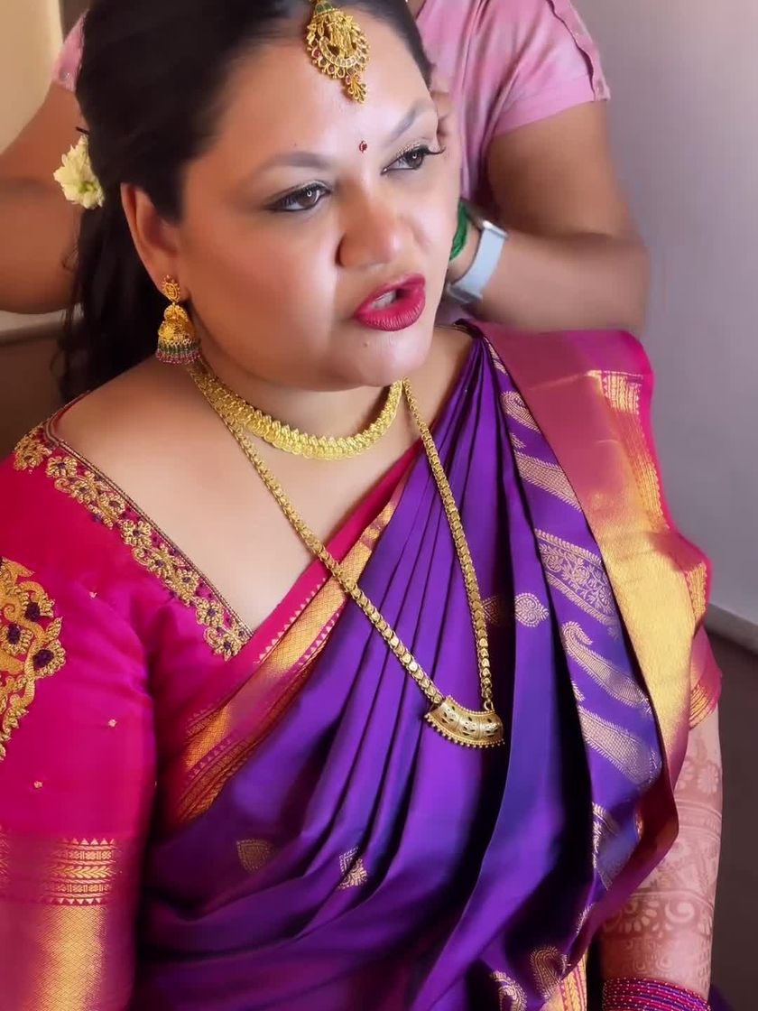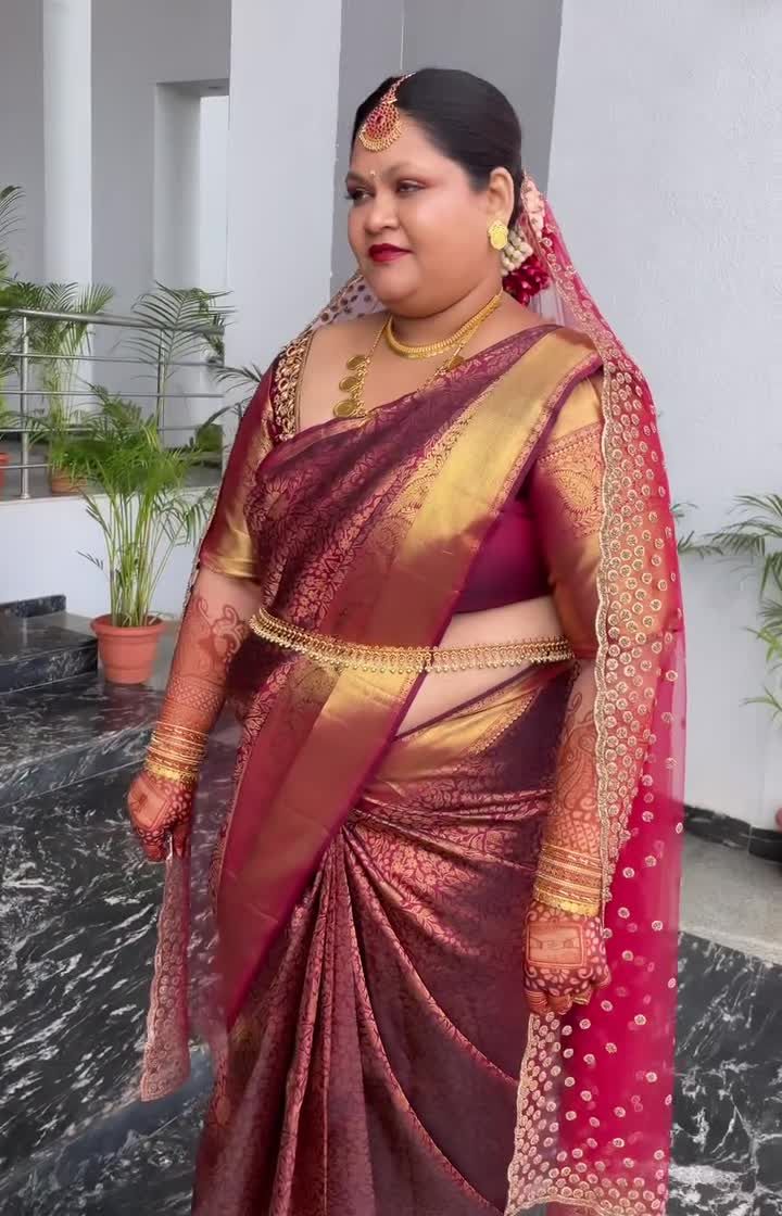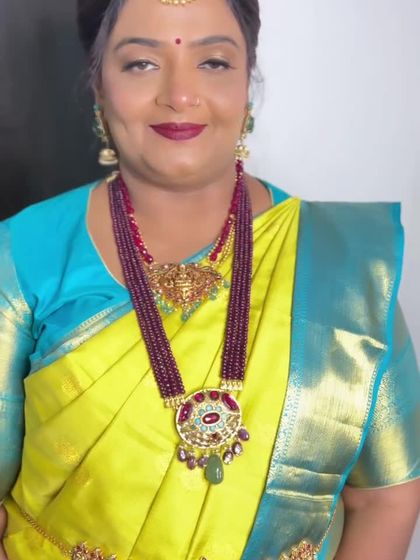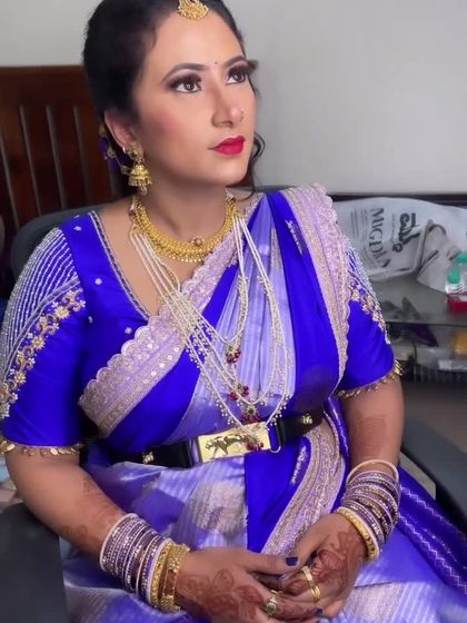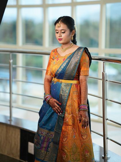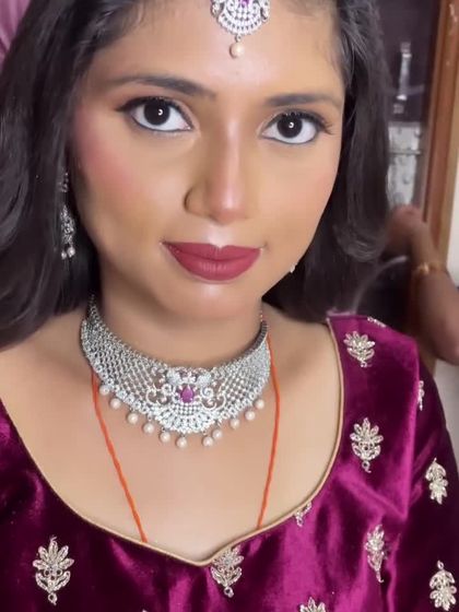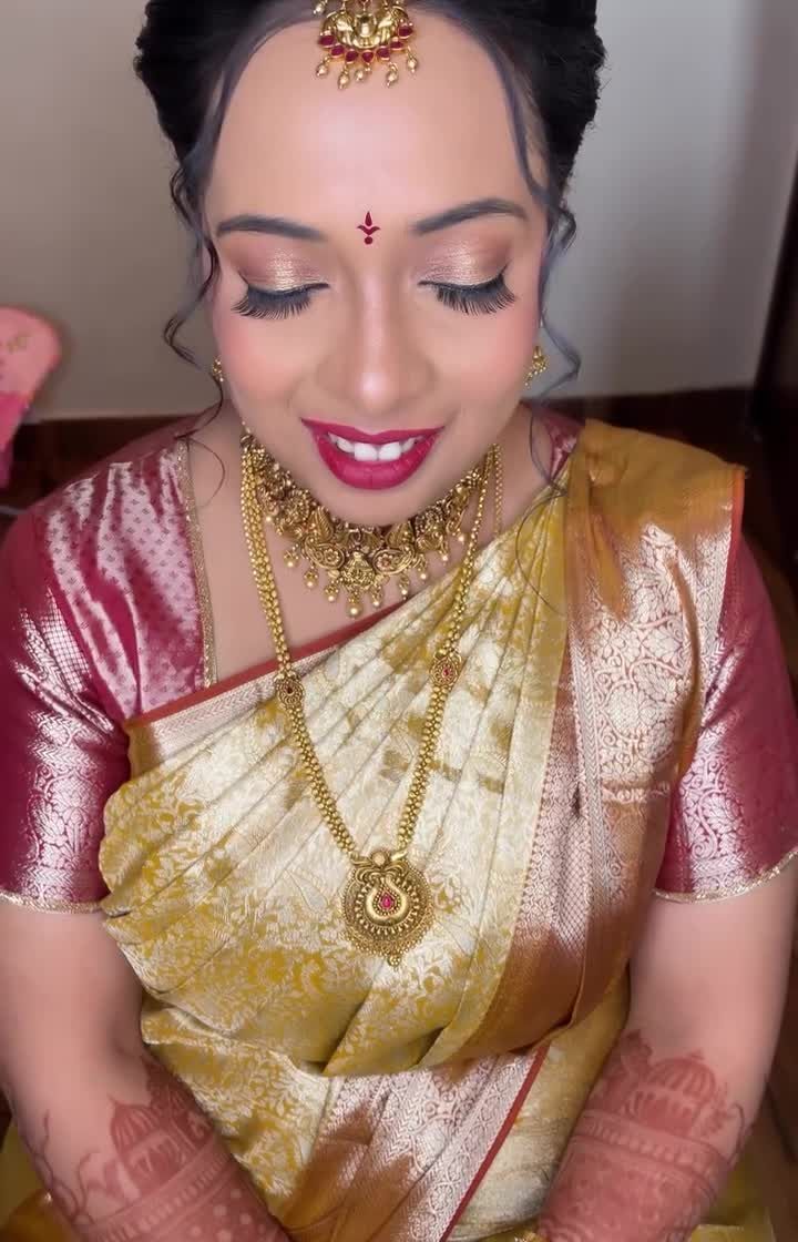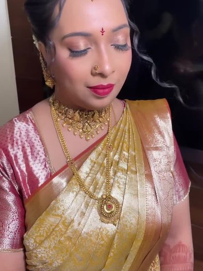 This is for the main wedding day, the muhurtham. I create timeless South Indian bridal looks with glowing skin, bold eyes, and classic red lips, ensuring you look perfect under the mandap lights. I also take care of traditional hairstyling with mallige hoovu and jadanagam, plus perfect saree draping.
