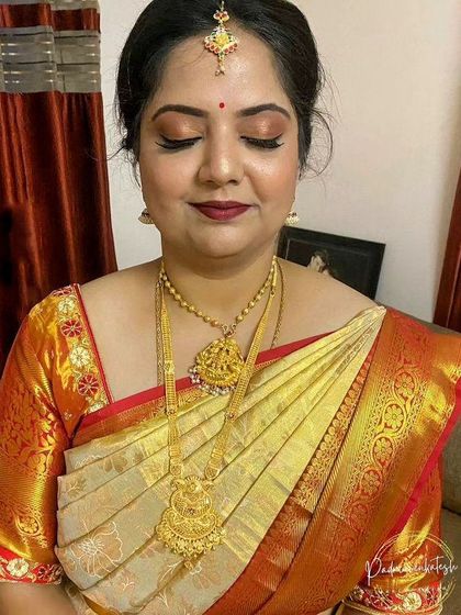 I specialize in creating elegant bridal looks, combining traditional and modern techniques. Using premium products like Huda Beauty and Sugar Cosmetics, I craft customized makeup transformations for all wedding events - from muhurtham to reception.