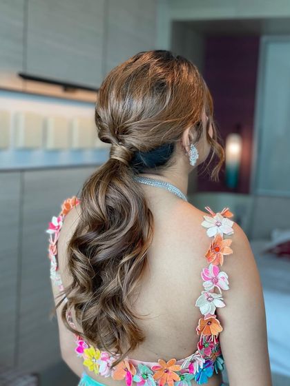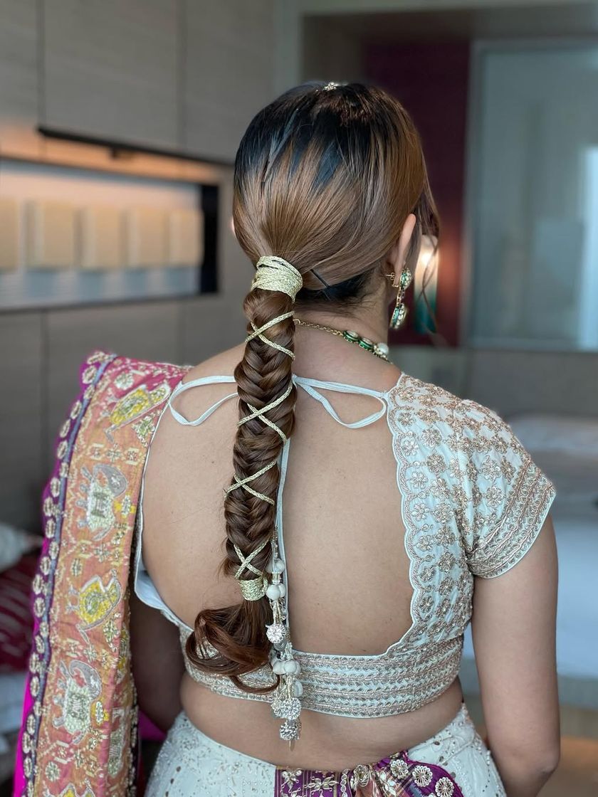 This section highlights my more structured and creative hairstyles. Here you'll find everything from modern, chic ponytails with crystal accessories to intricate braids woven with traditional threads like gotta patti, perfect for a Mehendi or Sangeet.
