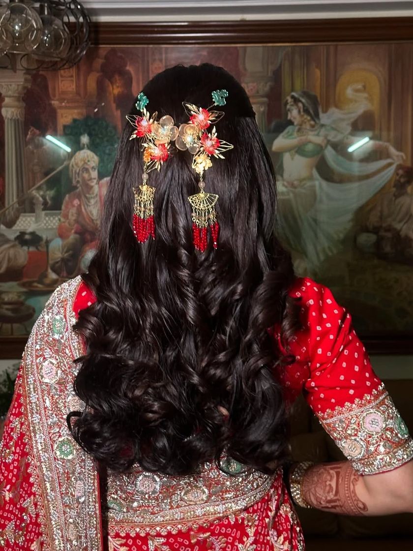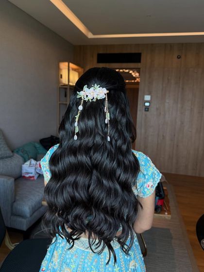 For brides who want to let their hair down, this section is all about movement and texture. I create everything from soft, romantic waves for a daytime event to voluminous, glamorous curls for a Sangeet or Reception. These styles can be worn fully open or in a chic half-updo, often accented with delicate accessories.