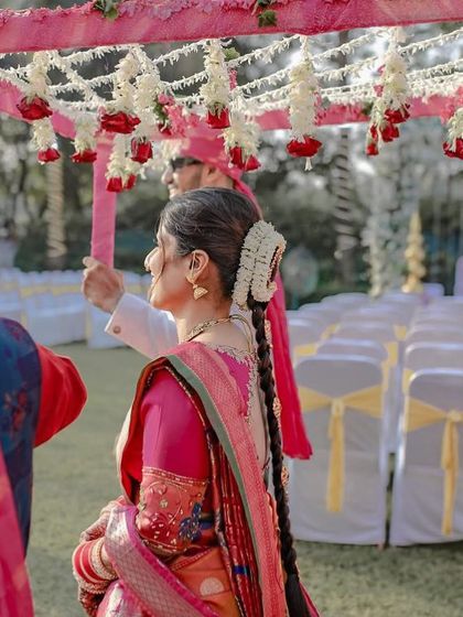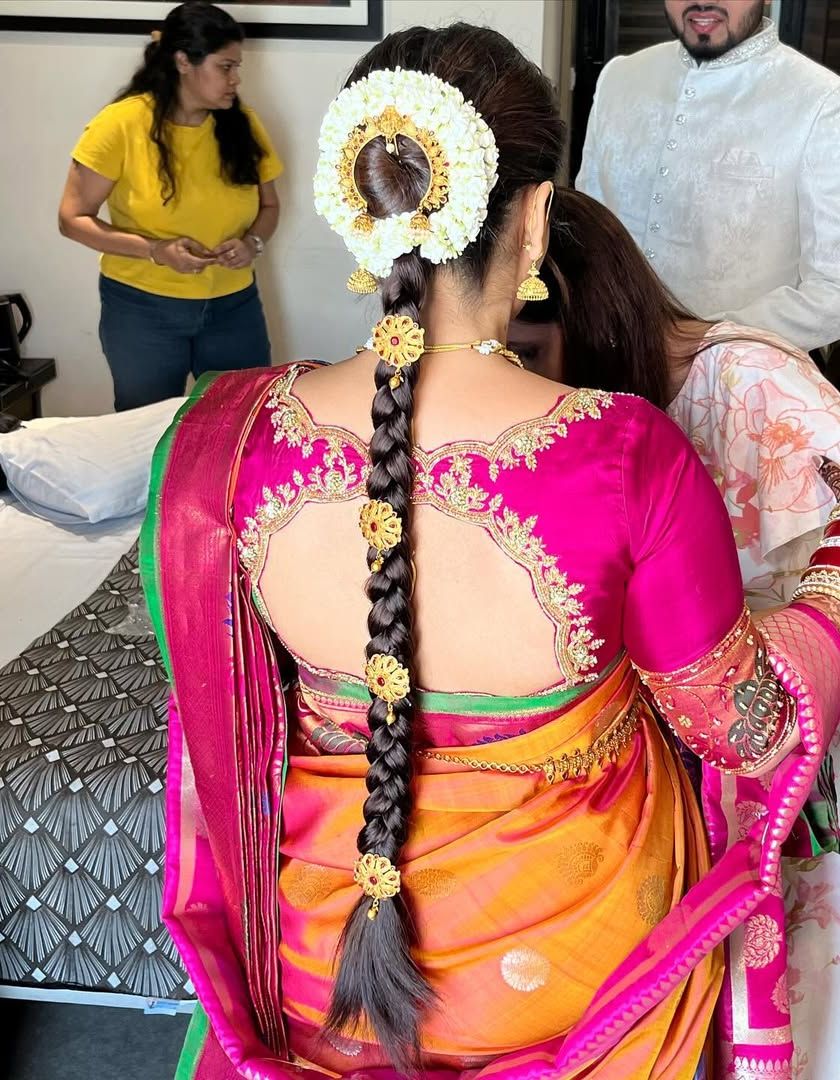 South Indian bridal hair is one of my passions. I love creating traditional looks, from classic temple-style braids adorned with intricate gold jewellery and `Jada` to beautiful buns surrounded by fragrant `gajra`. Each style is crafted to honor tradition while ensuring the bride looks absolutely divine.
