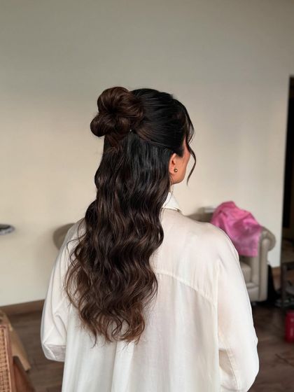 Get the best of both worlds with a half-up, half-down hairstyle. This versatile option keeps hair away from your face while still showing off beautiful length and waves. I customize these looks with twists, braids, or accessories for events like Mehendi, engagements, or cocktail parties.