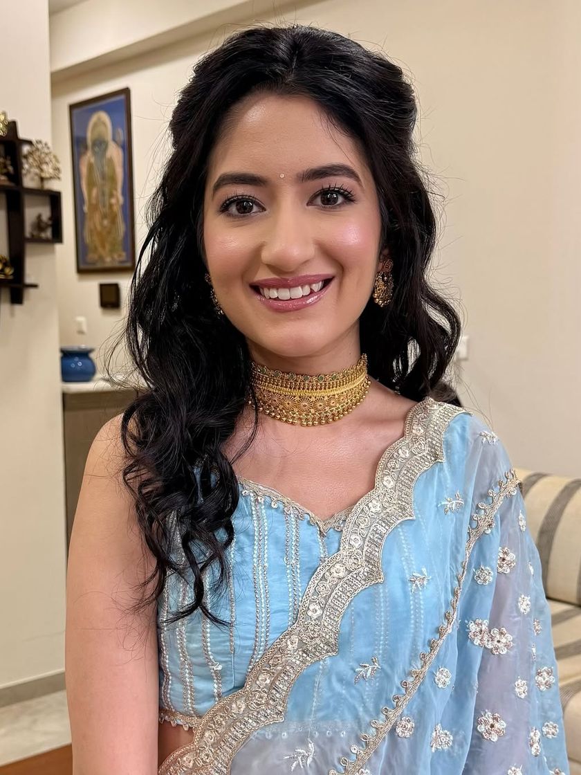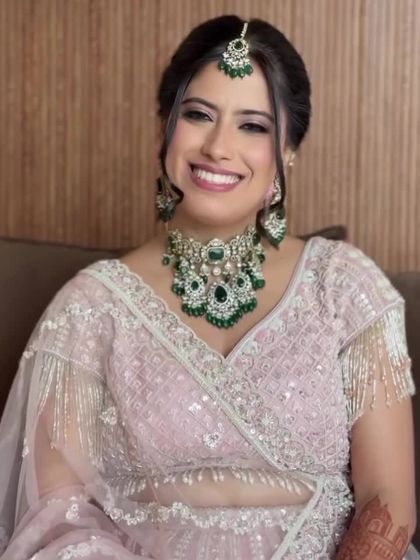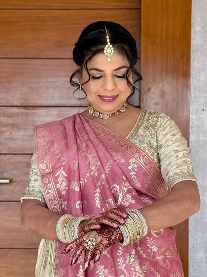 This is my most requested style, perfect for engagements, roka ceremonies, and modern receptions. I focus on creating a luminous, dewy skin finish that looks fresh and feels light. The look is completed with soft, shimmering eyes, natural-looking blush, and elegant hairstyles, often in pastel or neutral colour palettes.