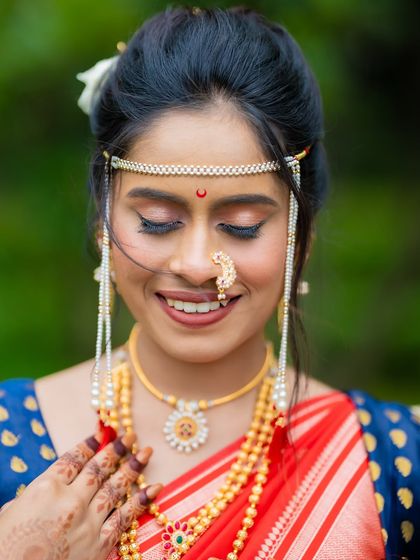 I especially love Maharashtrian bridal looks - Nauvari, Paithani, Khopa, Nath, Chandrakor bindi, Mundavalya. But I also do South Indian, Christian styles, and I know how to make dusky skin and curly hair shine. Your vibe, your story, your makeup.