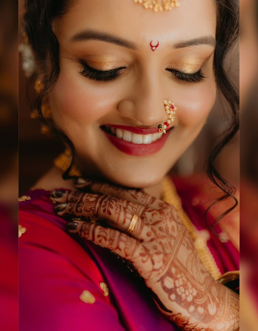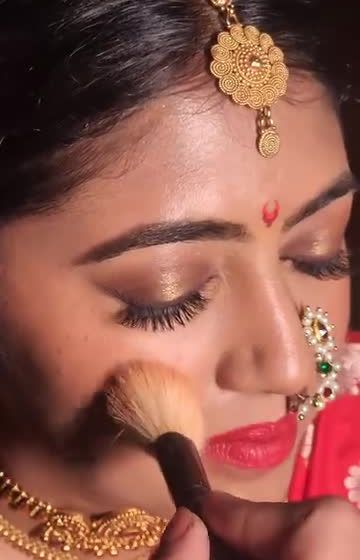 As a Marathi artist, I have a special love for creating the classic Peshwai look. I focus on achieving that signature golden glow, perfectly complemented by a traditional nath, a delicate chandrakor bindi, and a beautiful hairstyle, often a khopa or an intricate braid adorned with fresh flowers.