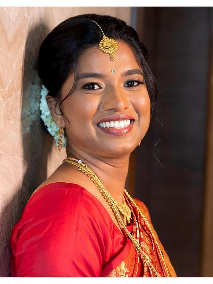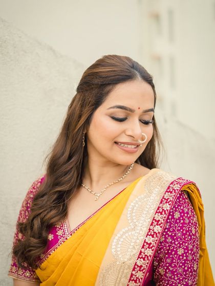 I do makeup, hair, and saree draping for brides, mums, and guests at your place, making sure everyone looks natural, feels comfortable, and gets ready together without stress.
