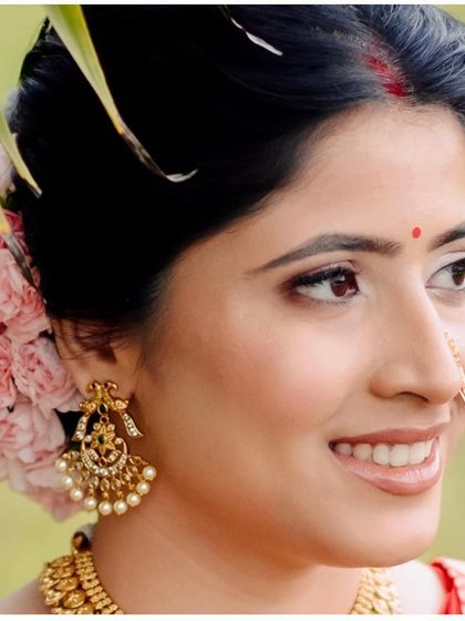I have a deep love for creating authentic traditional looks that honor our rich cultural heritage. Whether it's a classic marathmola bride with a traditional nath and khopa bun, or an elegant South Indian bride adorned in gold, I ensure every detail is perfect.