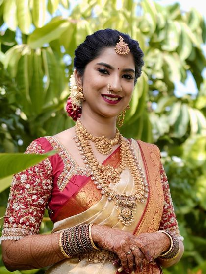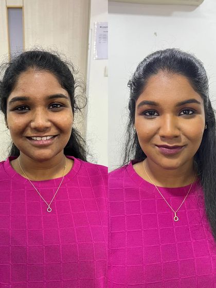 I do sweat-proof bridal and occasion makeup with real-skin finish, covering South Indian wedding styles and quick looks for bridesmaids and family.