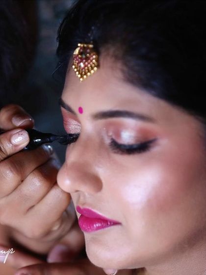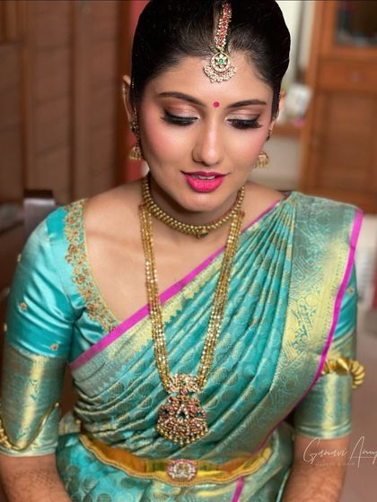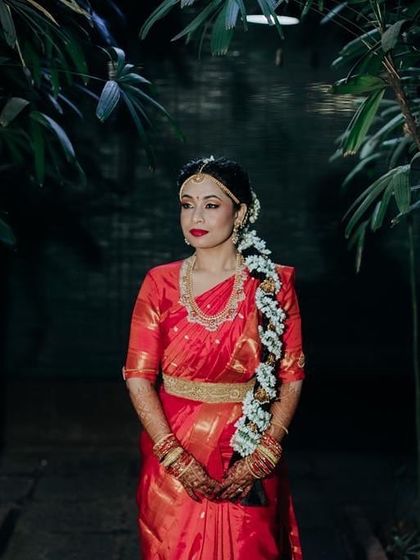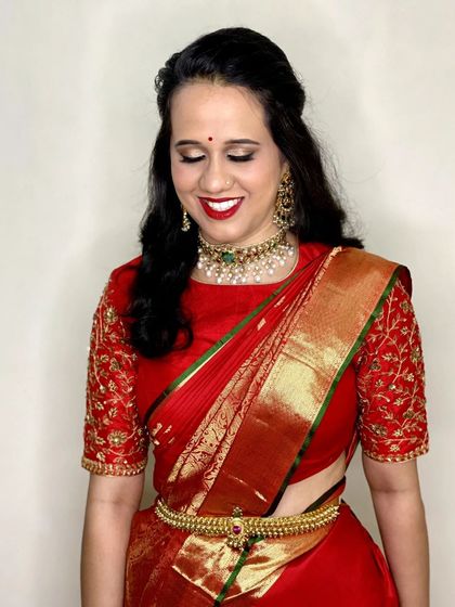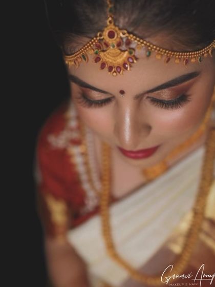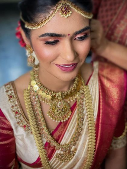 I'm an internationally certified pro makeup artist specializing in South Indian bridal and occasion makeup. My signature is a clean, soft glam look, using a light touch to create a confident and radiant you.