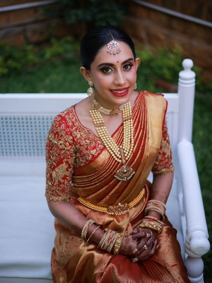 South Indian Bridal Specialist - Love working with South Indian brides - red lips, Kanchivaram silks, temple jewellery, all the classic details.