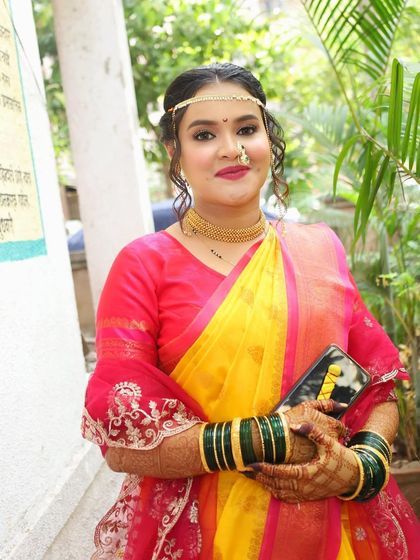 As a Mumbai-based artist, I have a special love for creating authentic Maharashtrian bridal looks. From the traditional nauvari saree and half-moon bindi to the intricate hairstyles with gajra, I ensure every detail is perfect for my beautiful 'navri'.