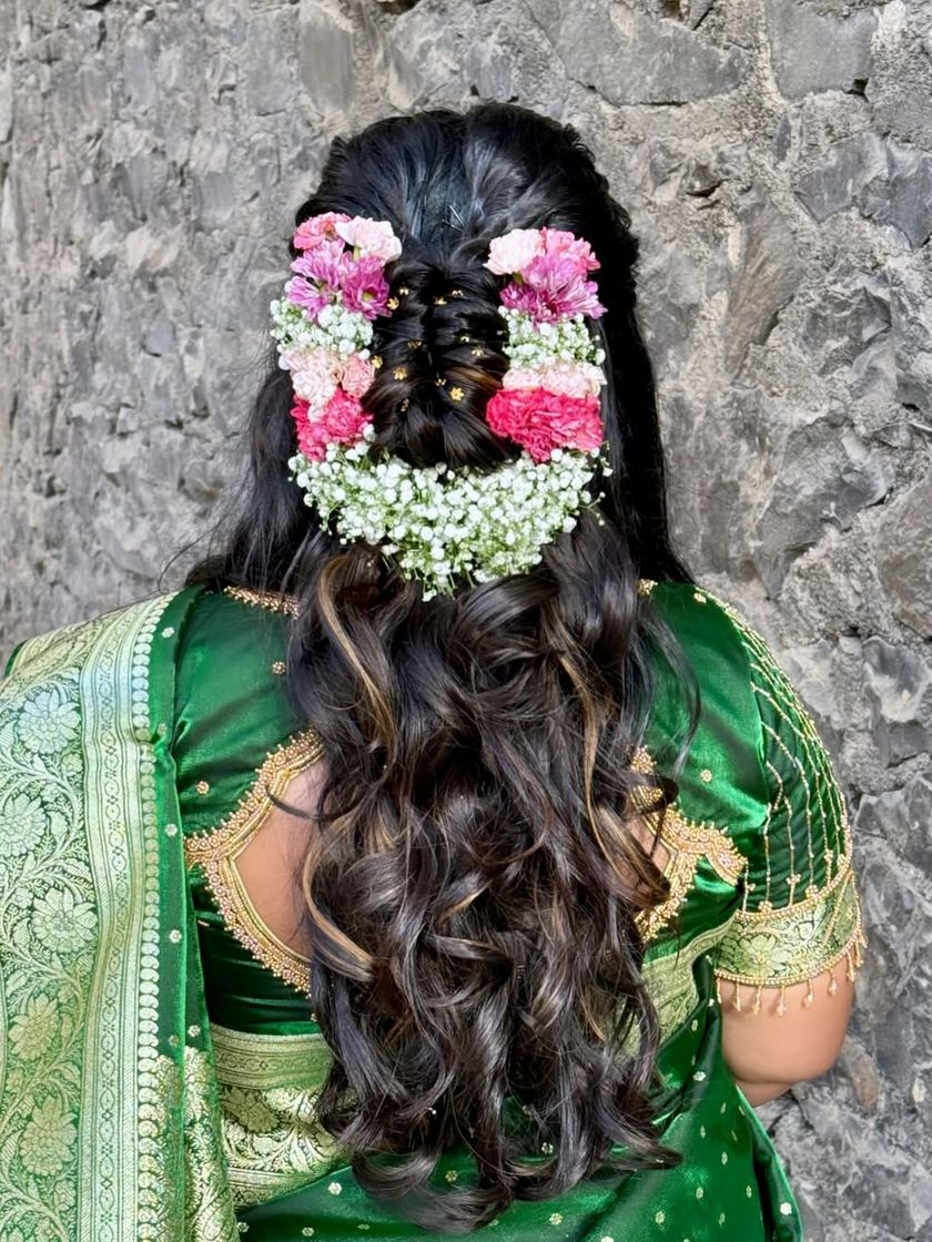 No look is complete without the perfect hairstyle. I design a range of styles from romantic soft waves and half-updos to intricate traditional buns and modern messy updos, often incorporating fresh flowers, gajra, or elegant accessories.