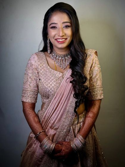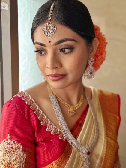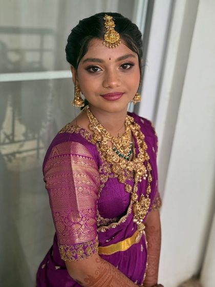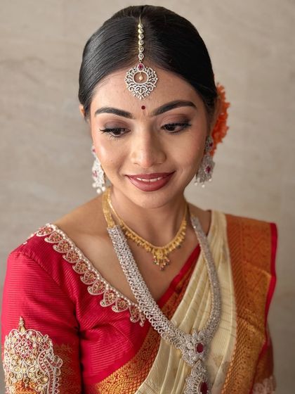 I do natural, long-lasting bridal makeup that matches your style, works for all skin types, and covers every wedding event from muhurtham to reception, with real results and full service including hair, saree draping, and travel.