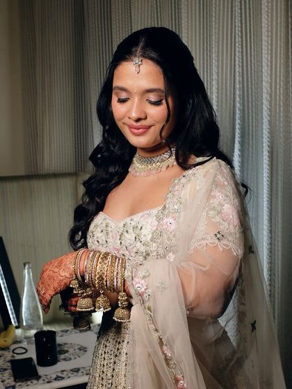 For daytime ceremonies, Nikah looks, or a modern aesthetic, I love working with pastels and ivories. I focus on creating a luminous, 'glass skin' finish with soft, romantic details that complement these lighter outfits.