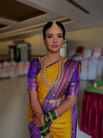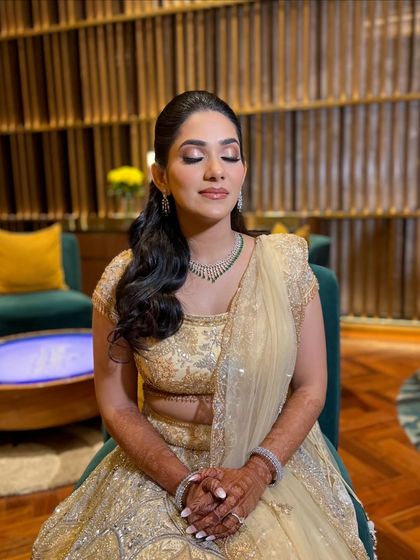 I do bridal makeup that keeps your real skin visible, gives a glass-skin glow, and matches each wedding event, whether in Mumbai or at your destination.