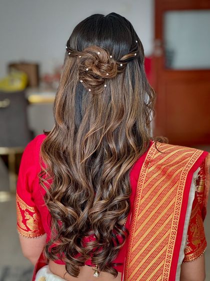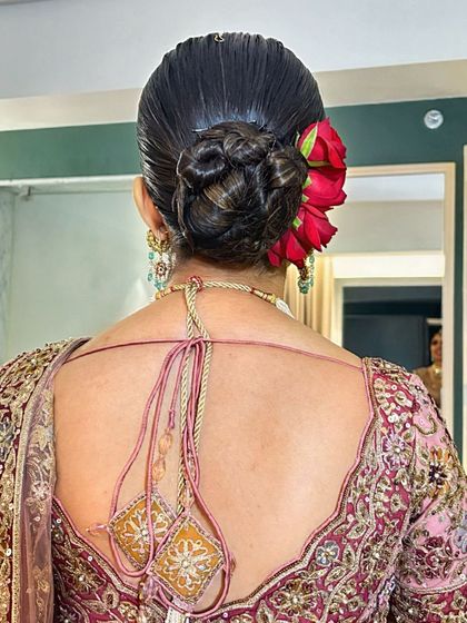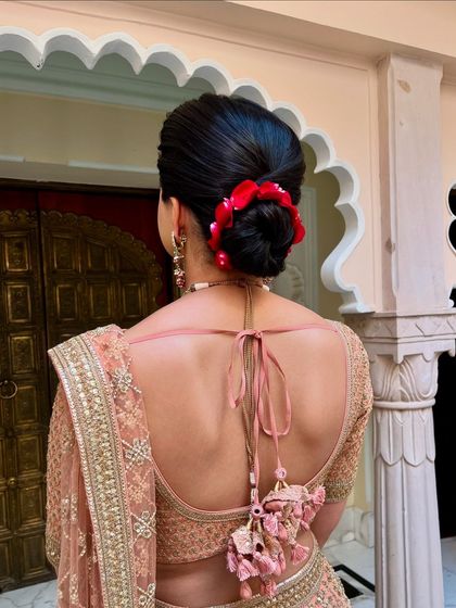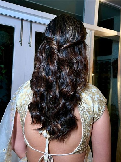 I specialize in creating stunning bridal hairstyles that complement your overall look. From traditional buns adorned with gajras to modern beachy waves and sleek ponytails, I work closely with you to design the perfect hairstyle for your special day.