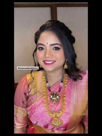 I specialize in creating authentic South Indian bridal looks, combining traditional elements with modern techniques. My expertise includes working with Kanchipuram silk sarees and temple jewelry to create a cohesive, traditional appearance.