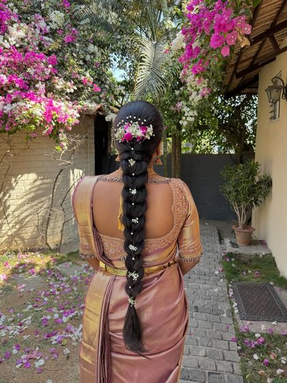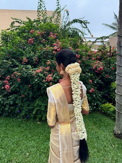 I specialize in creating elegant bridal hairstyles, particularly for South Indian weddings. My expertise includes traditional long braids adorned with flowers, contemporary reception styles, and event-specific looks that complement your overall bridal appearance.