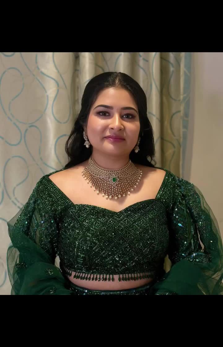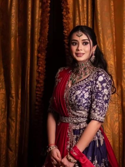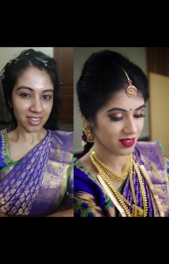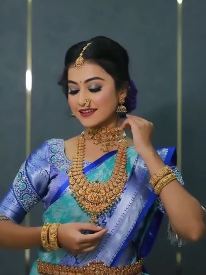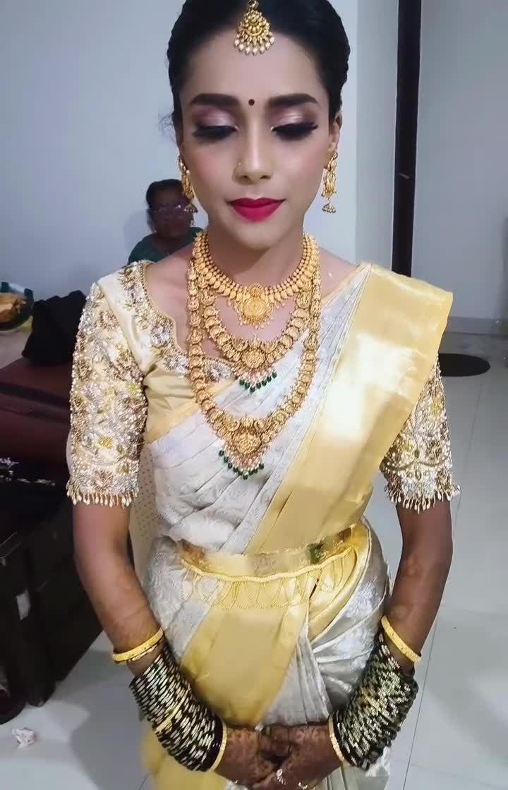 This is my absolute favorite. I specialize in creating the timeless, elegant South Indian bridal look that perfectly complements a traditional Kanchipuram saree. This includes radiant skin, defined eyes, and bold lips that look stunning with gold temple jewellery.