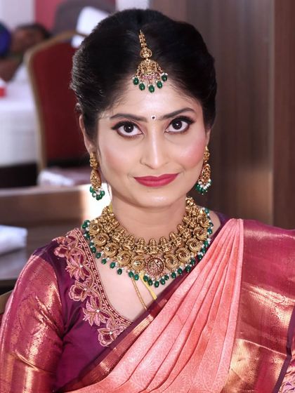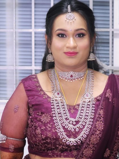 My specialty is creating timeless looks that honor our South Indian traditions. From Kanchipuram silk sarees to authentic temple jewelry, I design makeup and hair that perfectly complement your ethnic attire for weddings, muhurthams, and festivals.