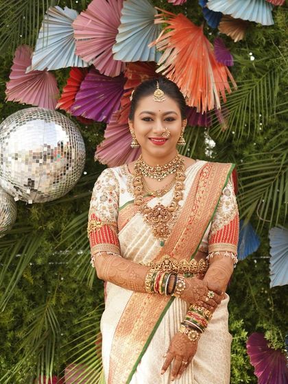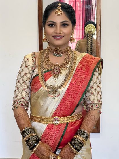 Hey, I’m Shwetha. Makeup isn’t just my job, it’s my way of keeping our traditions alive. ‘Nam mane Varamahalakshmi’ vibes (Lakshmi festival at my home) always find their way into my work, especially when I’m with my brides. I want every bride to feel like she’s stepped out of her own dream, full of confidence and joy. Being part of someone’s big day? Pure honour for me.