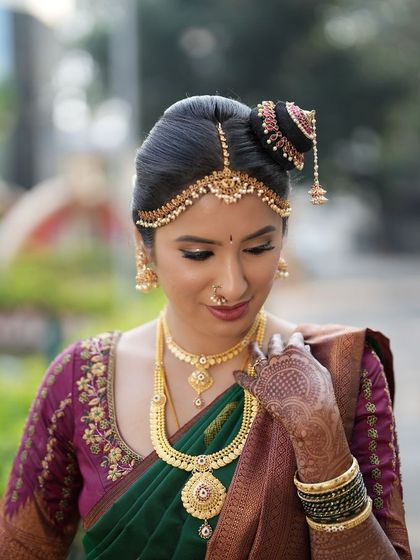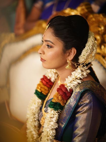 I specialize in creating subtle, dewy makeup looks for South Indian brides, particularly for Iyengar and Brahmin weddings. My services include HD makeup application using luxury products, traditional hair styling with flowers and gold accessories, and expert saree draping.