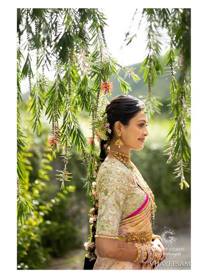 I do customised bridal makeup, hairstyling, and saree or lehenga draping for all wedding events, including destination weddings, with looks tailored to your comfort and style.