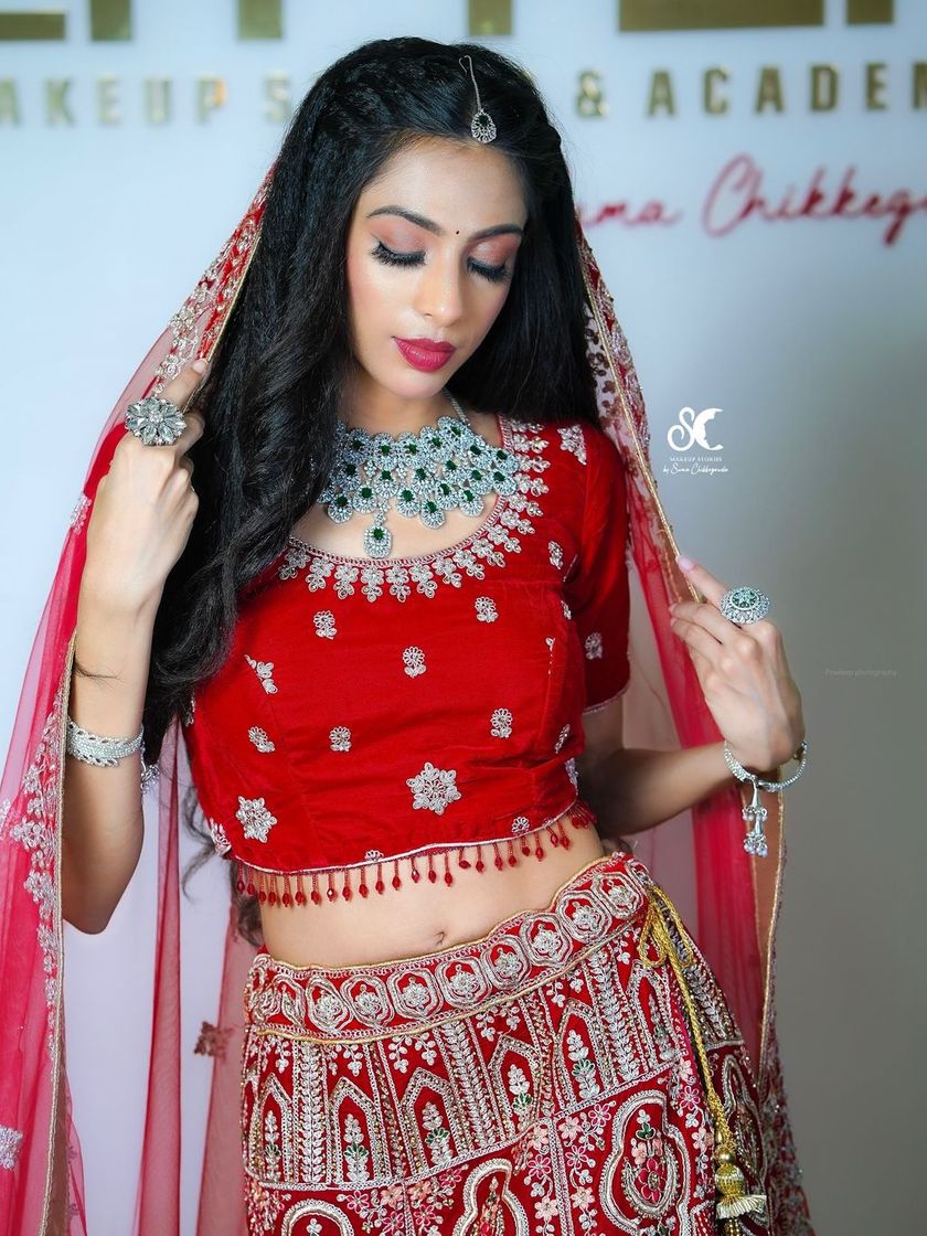 To ensure my students are versatile, we also master North Indian bridal looks, characterized by red lehengas and dramatic styling. This is where I often teach airbrush makeup, a premium technique for achieving an absolutely flawless, HD-ready, and long-wearing finish.
