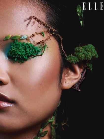 This is the complete beauty editorial 'Becoming Earth,' featured in ELLE India. The concept explores a primal metamorphosis, using makeup and natural elements like moss, vines, and roots to portray a plant-like transformation, moving beyond traditional floral beauty themes.