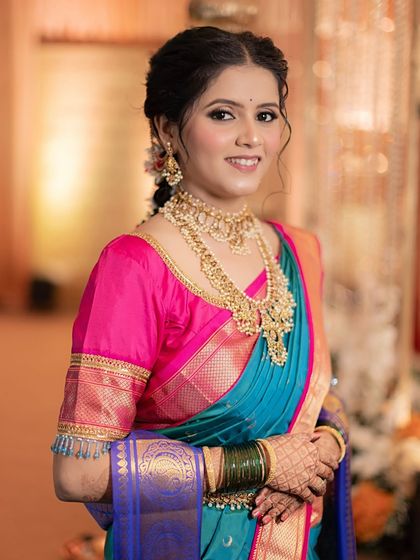 We do natural, dewy bridal and event makeup, hair styling, and saree draping for all wedding functions, with special expertise in Maharashtrian and South Indian looks.