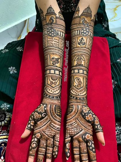 I create custom bridal mehandi with your story, portraits, and wedding details, covering hands and feet with deep stain, and I come to your home anywhere in Mumbai region.