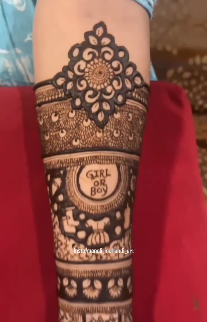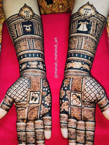 I design unique mehandi for your Dohale Jevan, filled with personal touches to celebrate this milestone. We can incorporate elements like baby portraits, cradles, tiny feet, and special notes like 'Mom to be' or 'Aai' and 'Baba'.