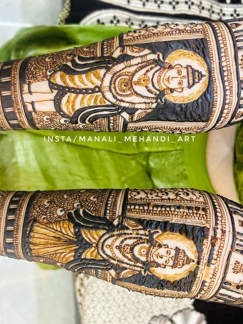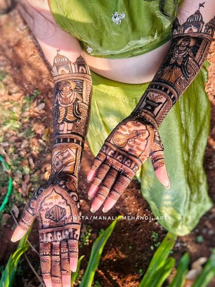 I specialize in mehandi for all festivals, including Ashadhi Ekadashi, Janmashtami, and Diwali. My services include intricate deity portraits like my 'Vithu namachya rangat' designs, as well as other spiritual symbols.