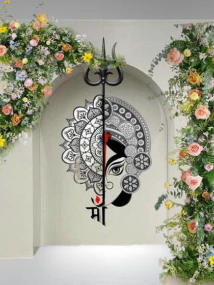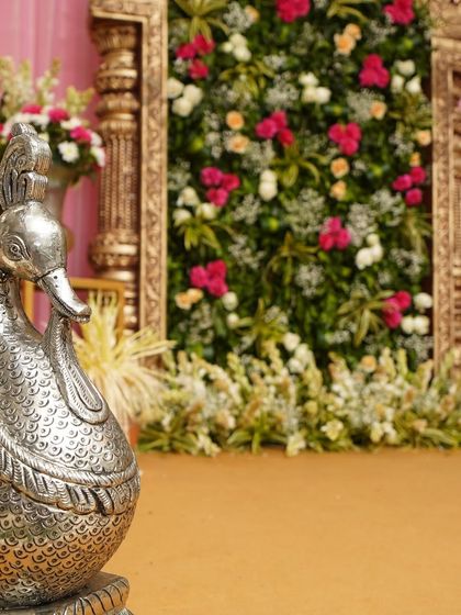 Story-Based Event Design - We design events around your story. Like for 'Mitakshi', we used mandal art and peacock motifs to bring her name alive.