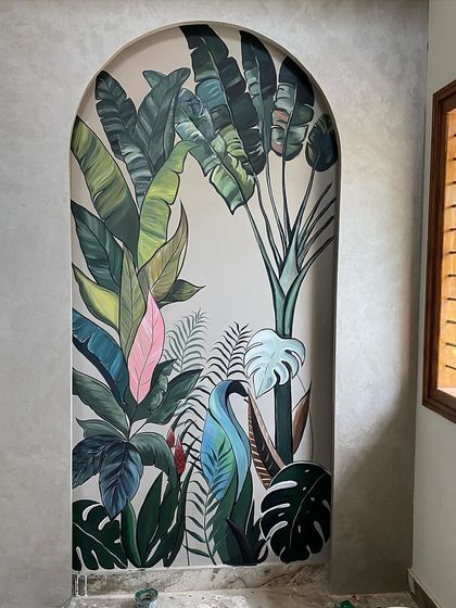 I work with high-quality paints and can create diverse themes from tropical and nature-inspired to abstract designs. My murals have transformed spaces from pooja mantaps to dance studios.