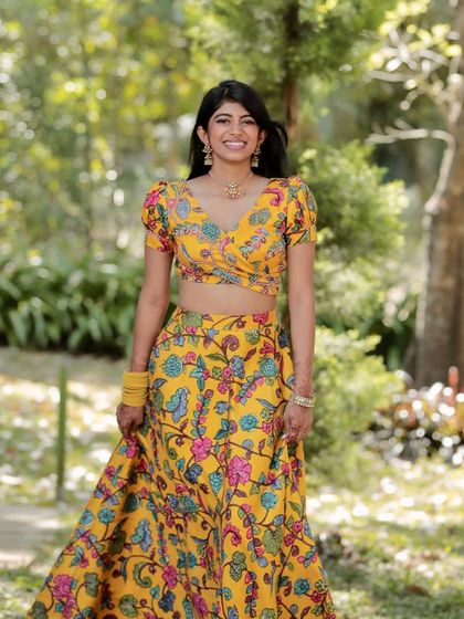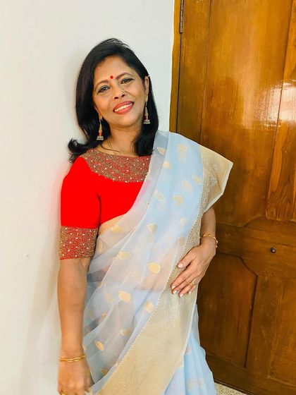 I design and stitch custom blouses, lehengas, and outfits in my Bengaluru studio, including upcycling old sarees and sourcing authentic fabrics for a personalized fit.