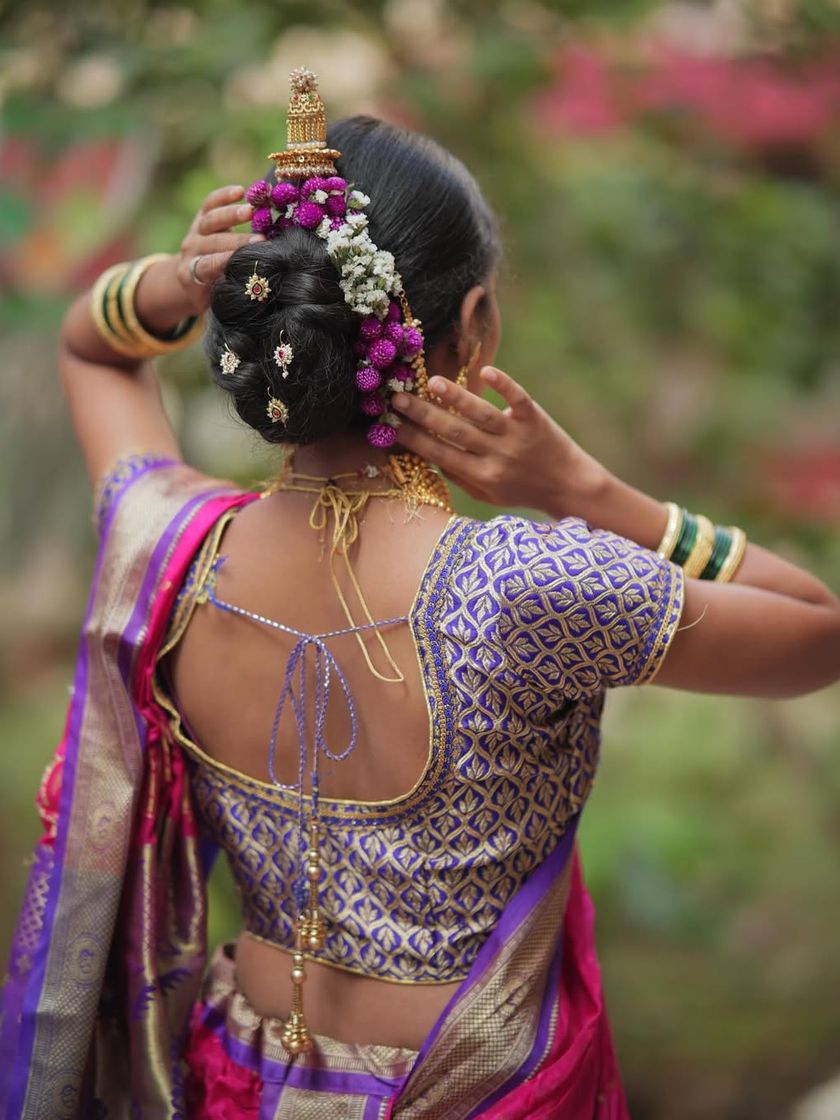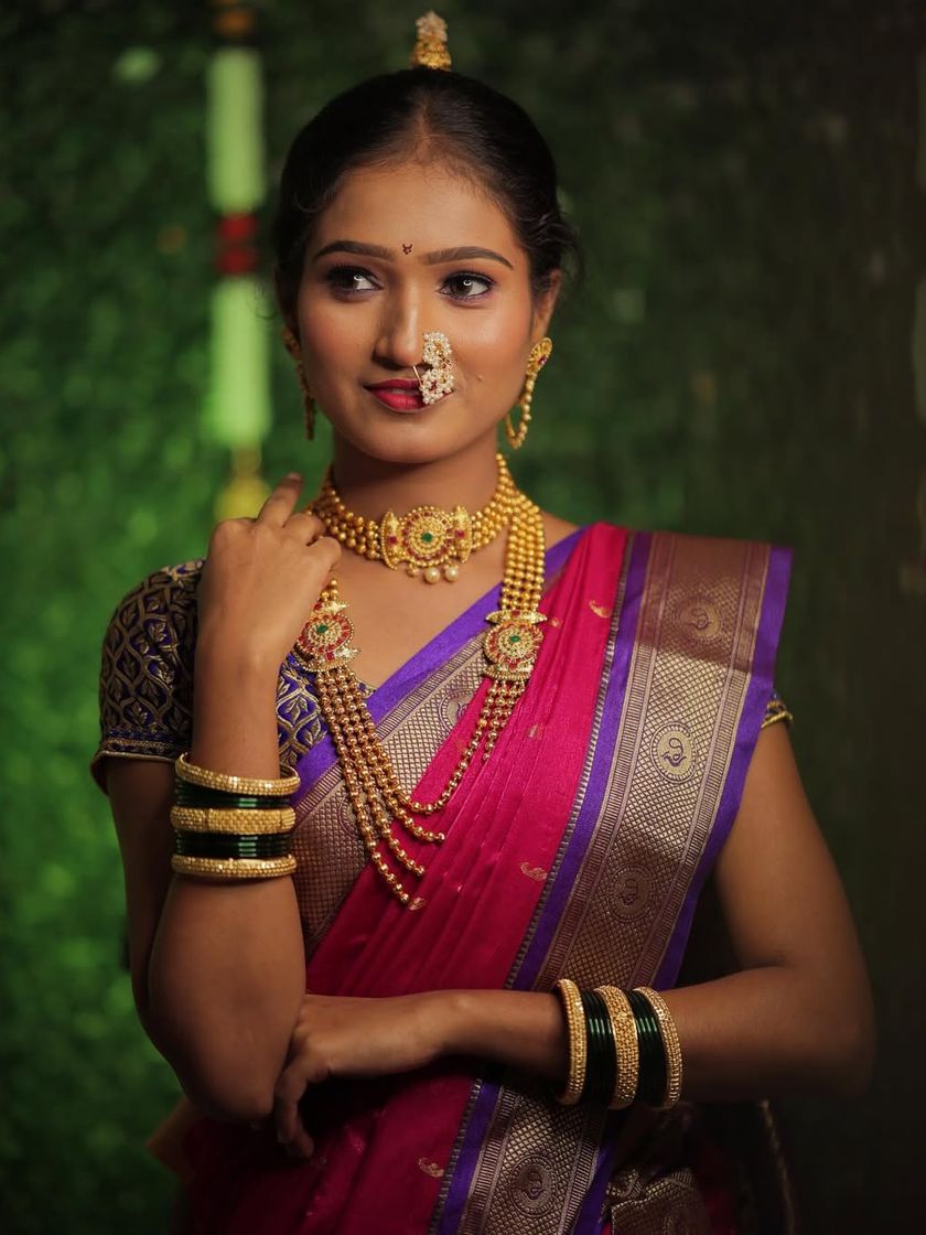 My heart lies in creating authentic Maharashtrian looks. I provide complete styling for weddings and engagements, including Nauvari saree draping, traditional 'khopa' hairstyles, and makeup that feels both classic and fresh. I also style for other ceremonies like baby showers, ensuring every detail is perfect.