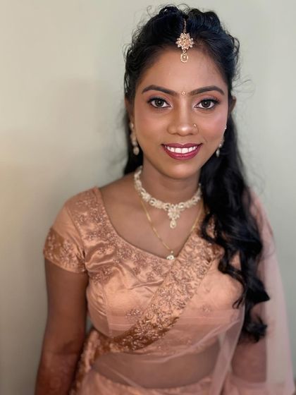 A complete look is more than just makeup. I offer professional hairstyling, from traditional buns adorned with flowers to modern open curls. I also provide expert saree draping services, including pre-pleating, to ensure you look perfect and feel comfortable.