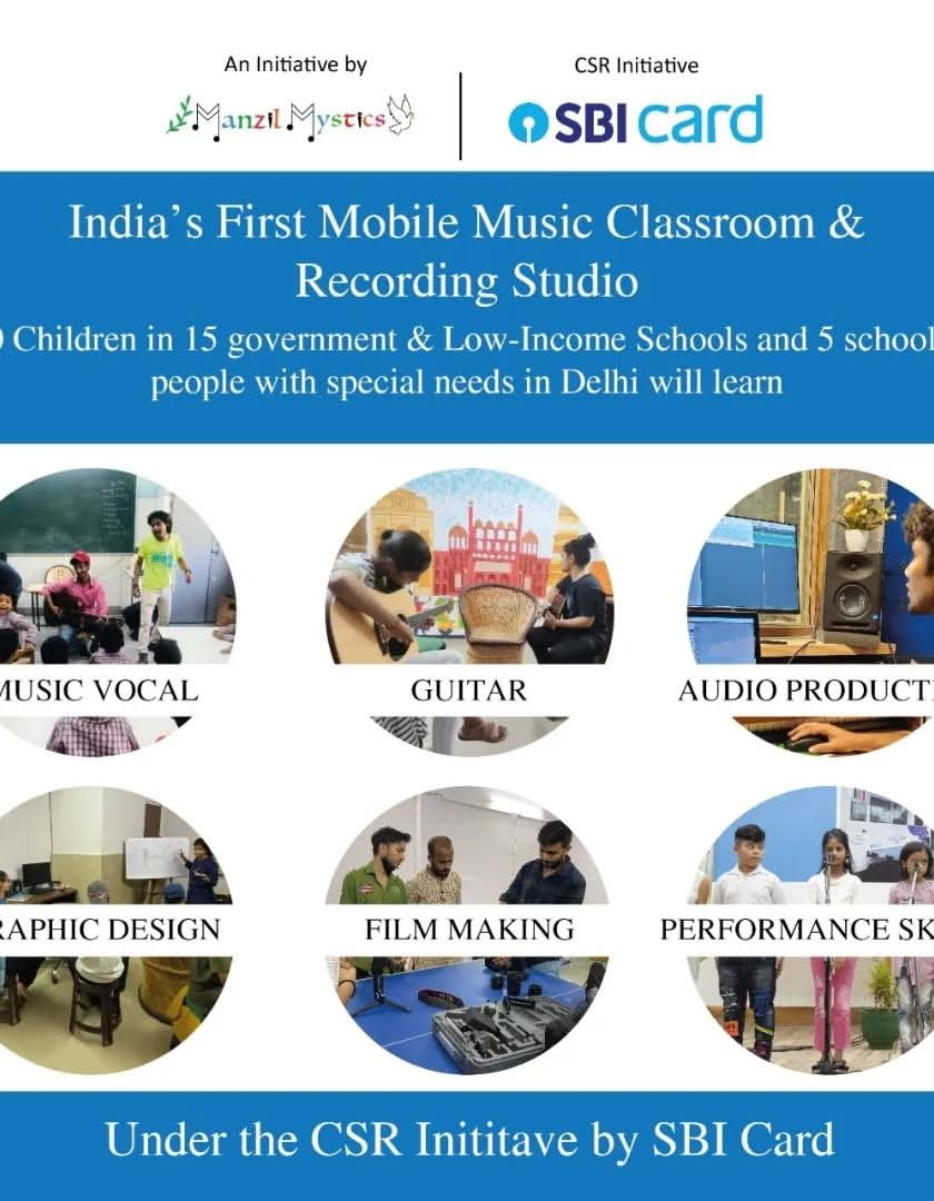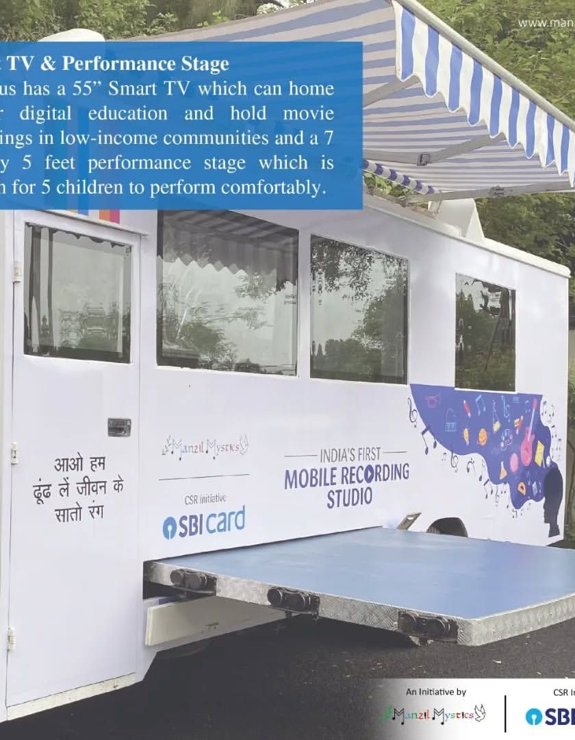We bring the magic of music directly to communities with India's first mobile music classroom and recording studio. This bus is a moving stage and studio, giving children the chance to record their voices, learn about audio production, and perform for the first time.