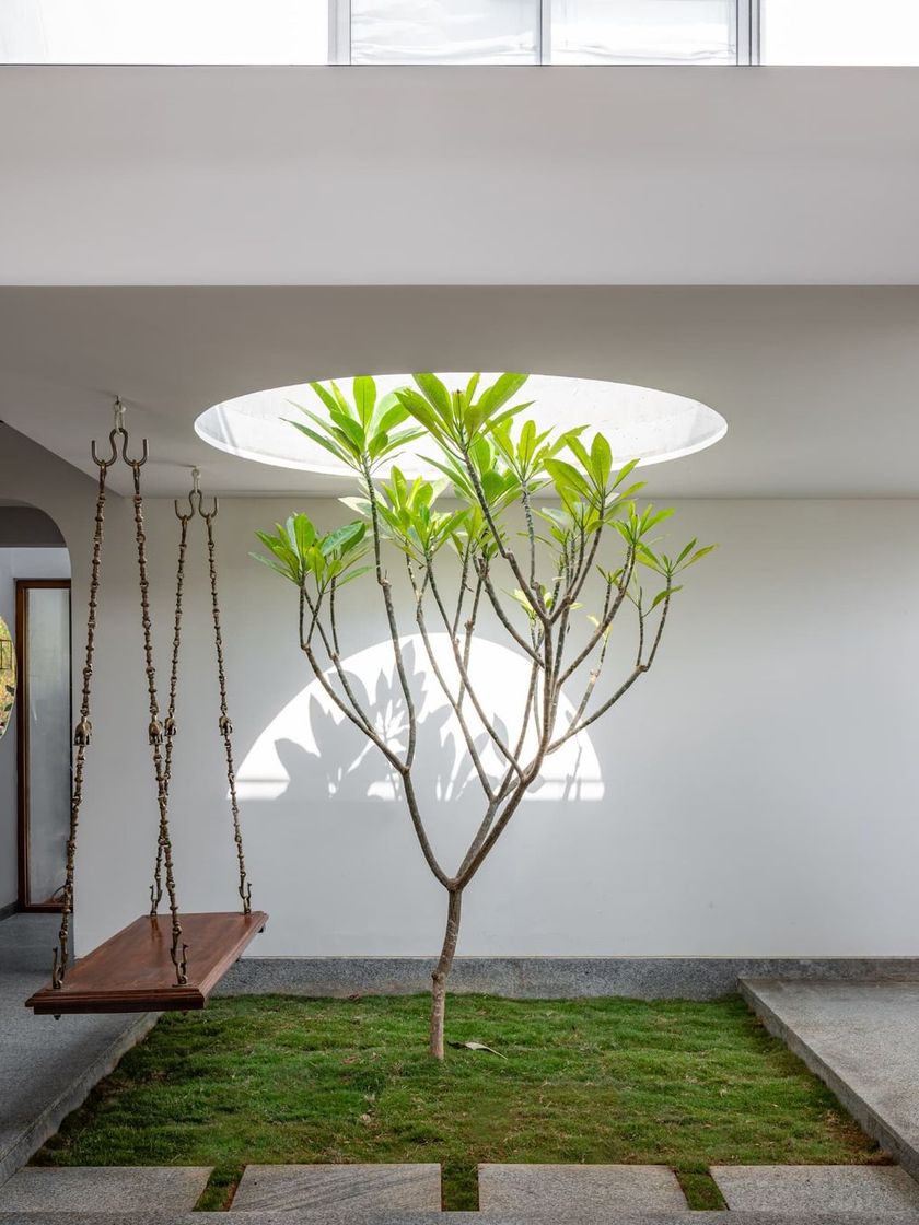 This 3500 sq ft new build in Bangalore was designed for a family of four and their three dogs, focusing on shared spaces and a seamless indoor-outdoor connection. The design is organized into three linear blocks along a central E-W axis, separating public and private functions with green courtyards.
