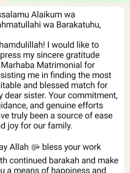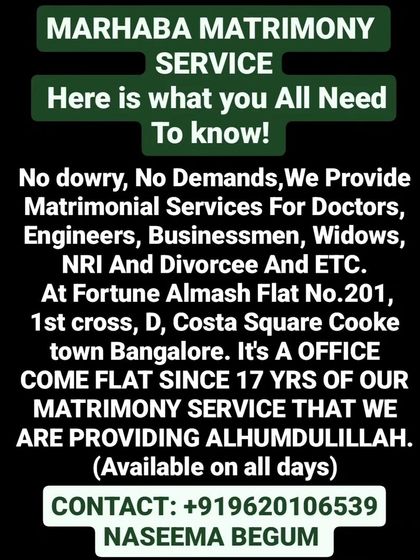Marhaba, Assalamu Alaikum. We’re Marhaba Matrimony, doing this for 17 years, Alhamdulillah. For us, matchmaking isn’t just business, it’s *khidmat* (service). We believe *rishte aasmaan par fix hote hai* (matches are made in heaven), and we’re just Allah’s instrument. Strictly no dowry, no demands. When two families unite, that’s real *barakah*. You just need faith and patience. Your day will come, in sha Allah.