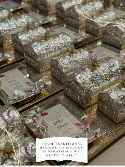 We handle everything for wedding gifting and trousseau packing including custom invitations, themed hampers, decorated trays, and bulk guest gifts, all made with handcrafted details and personalised designs.