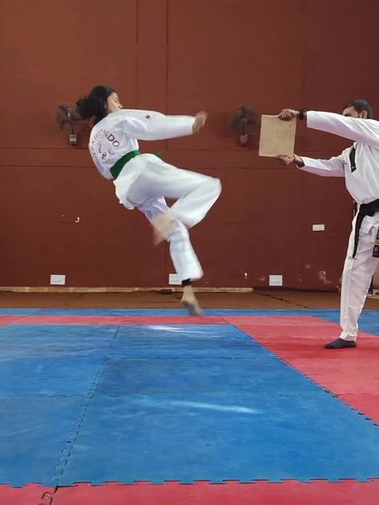 Taekwondo is a core part of my training, focusing on powerful kicks, discipline, and precision. Here you can see my students practicing their forms and demonstrating their power by breaking boards during belt tests.