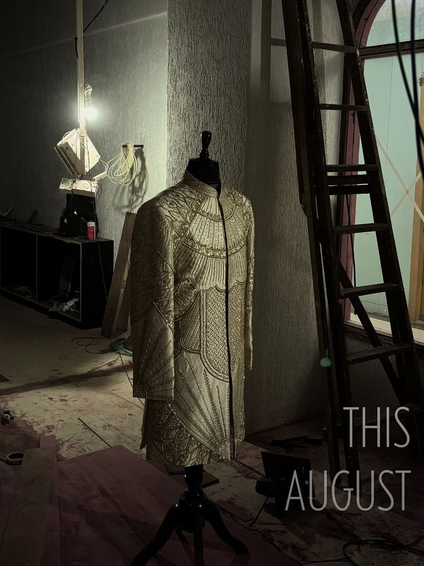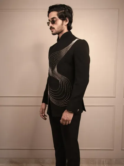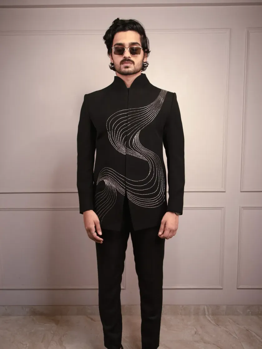 This collection is for sangeets, cocktail nights, and receptions. I blend traditional Indian craftsmanship with contemporary silhouettes, including our signature 'Illusion' and 'Grooved Lines' embroidery, modern bandhgalas with zipper details, and unique textured jackets.