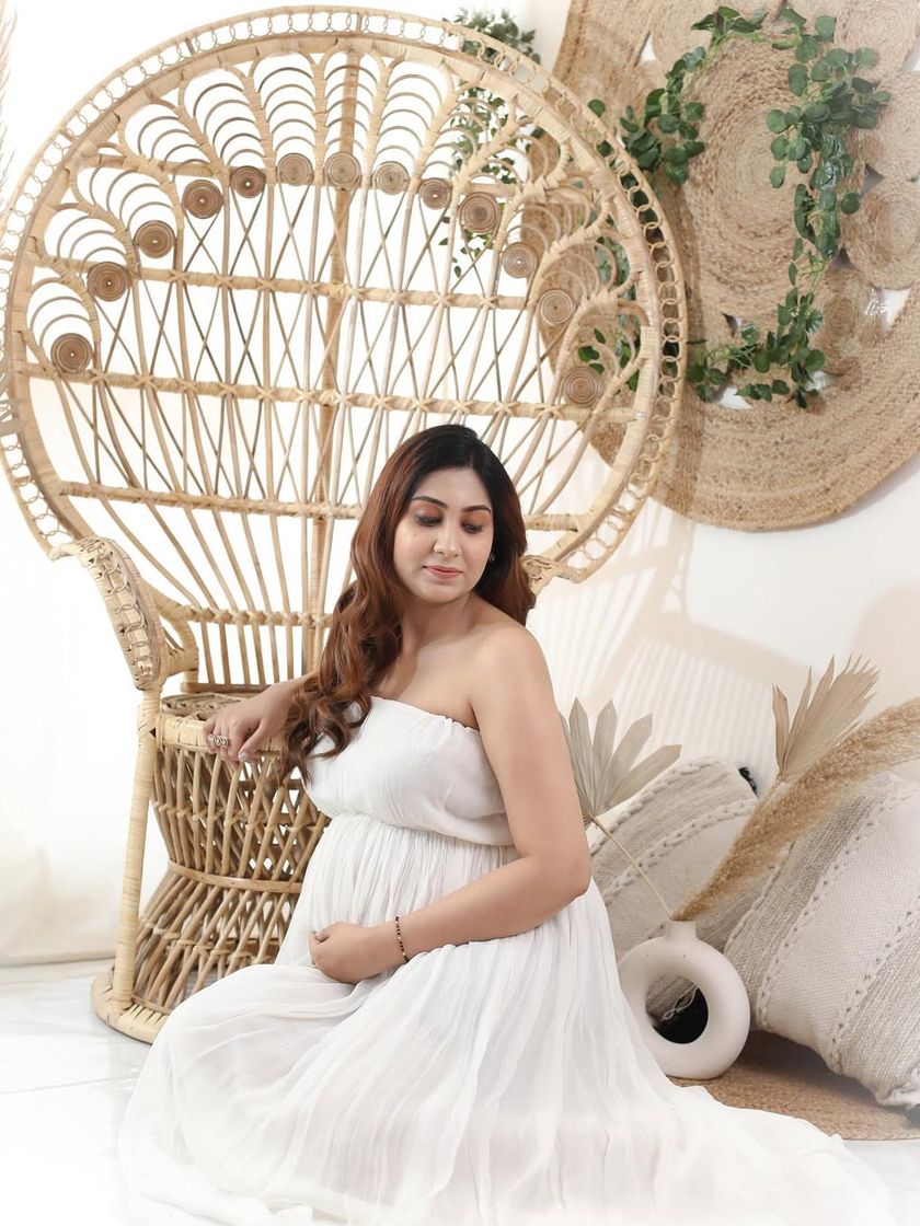 For the free-spirited mom, these sessions use natural textures and light to create a raw and real feel. We use props like my popular peacock chairs, pampas grass, and jute decor for a relaxed, earthy, and beautifully bohemian maternity shoot in my Noida studio.