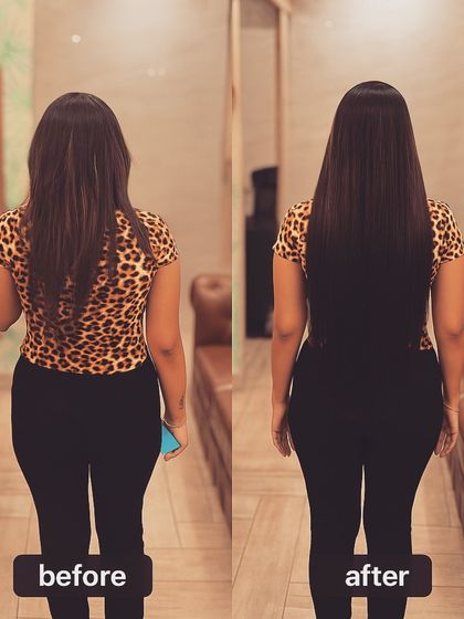 We do one-on-one hair treatments like keratin, nanoplastia, and Hair Botox, plus custom coloring and highlights, always matched to your hair for a natural look.