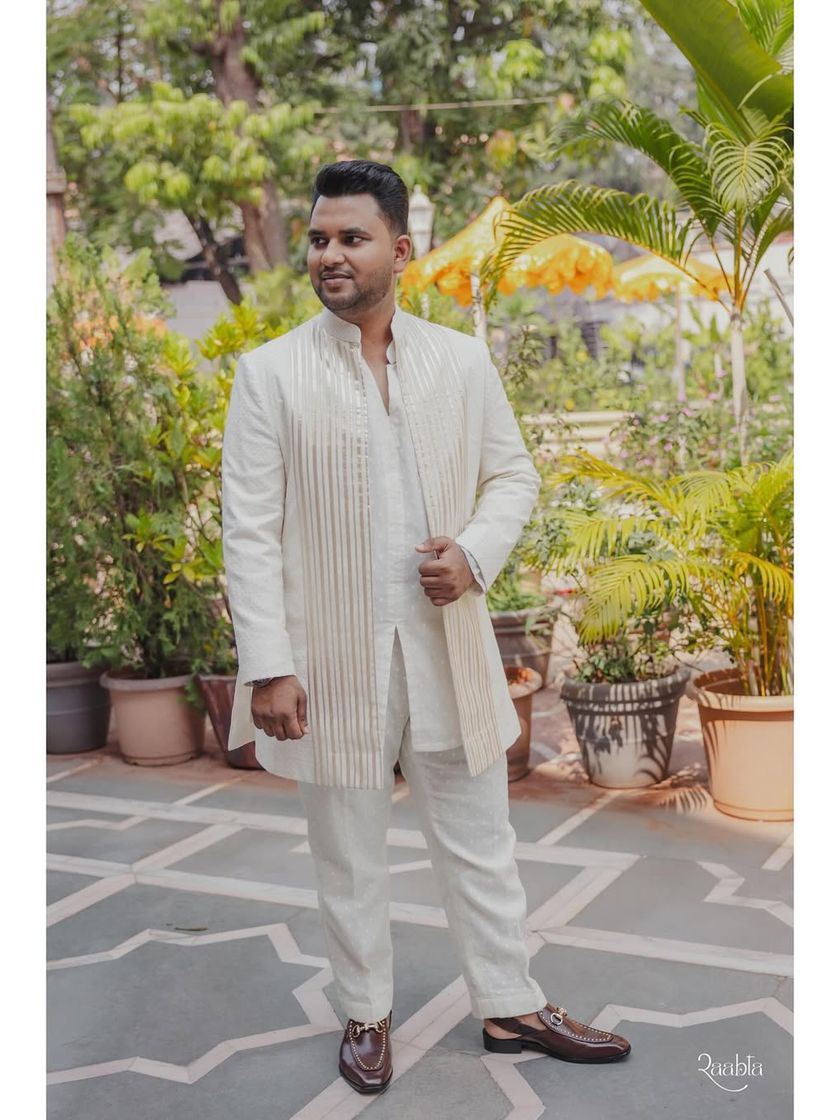 I help grooms define their personal style for the big day and beyond. I specialize in creating bespoke outfits, from sharp, custom-tailored tuxedos and jacquard jackets to unique tone-on-tone kurta sets that reflect your personality.